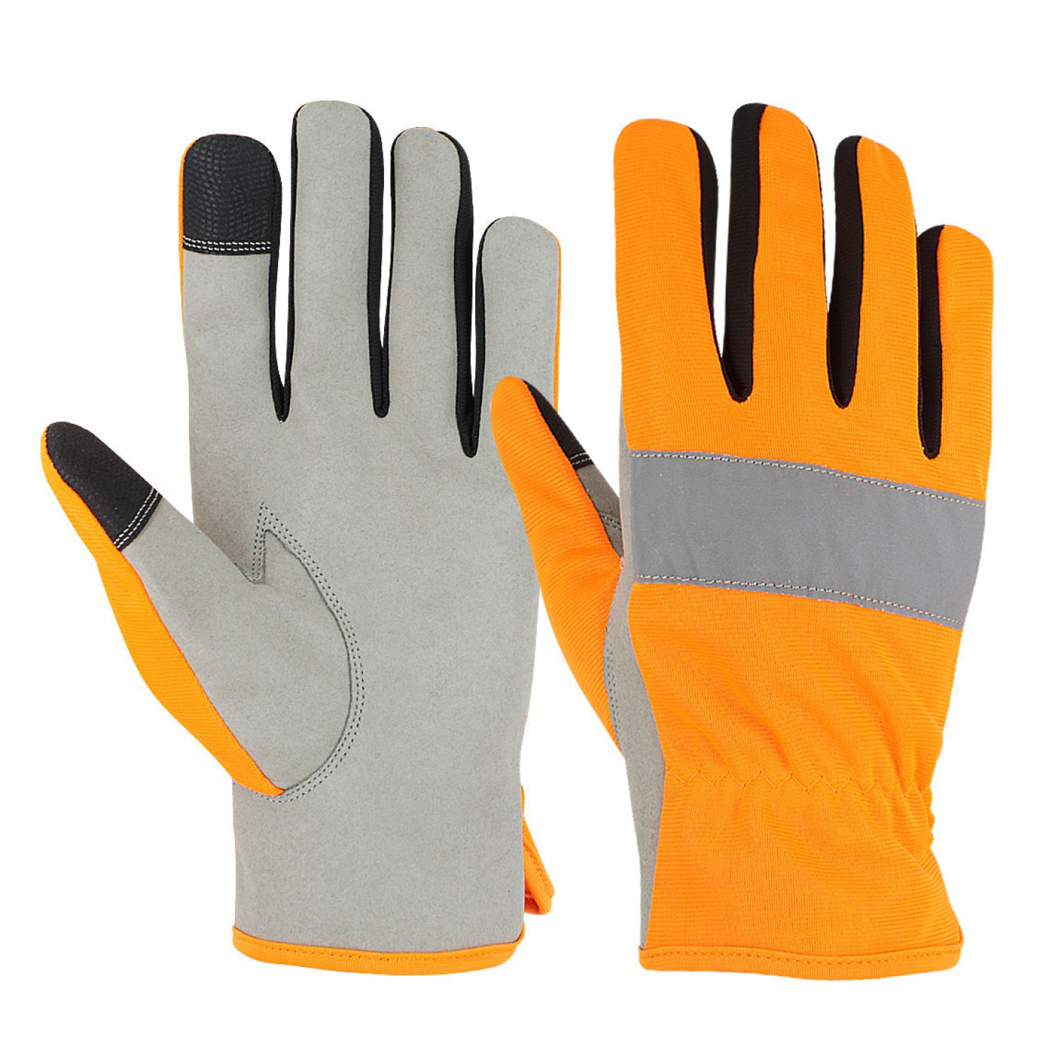 Front made from M/O synthetic leather with touch-compatible fingertips, and Trinda fabric back with reflector knuckle for visibility, finished with polyester piping.